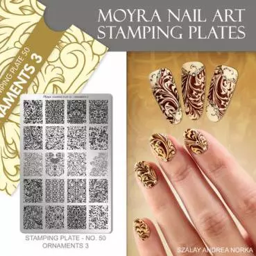 Der Motiv-Vielfalt der Stamping Platten von Moyra sind kaum Grenzen gesetzt. Jede unserer Schablonen enthält mind. 20 gestochen scharfe Stampingmotive.Mit der Stamping Platte Ornaments 3 Nr.50 von Moyra schaffen Sie besonders schnelle und schöne Nail Art. Die Muster und Ornamente lassen sich durch die Stamping Technik besonders leicht und lupenrein auf den Nagel übertragen. Mit derzeit bereits über 1700 Motiven schaffen Sie für sich selbst oder für Ihre Kunden eine ganz besondere, individuelle Nail Art, die einen bleibenden Eindruck hinterlässt. Und das in kürzester Zeit. Die Moyra Nailart Stamping Platten können mit speziellem Stampinglack, Stamper und Scraper bearbeitet und sowohl auf Nagellack, Gel Lack, Colour Gel als auch auf Acryl angewendet werden.